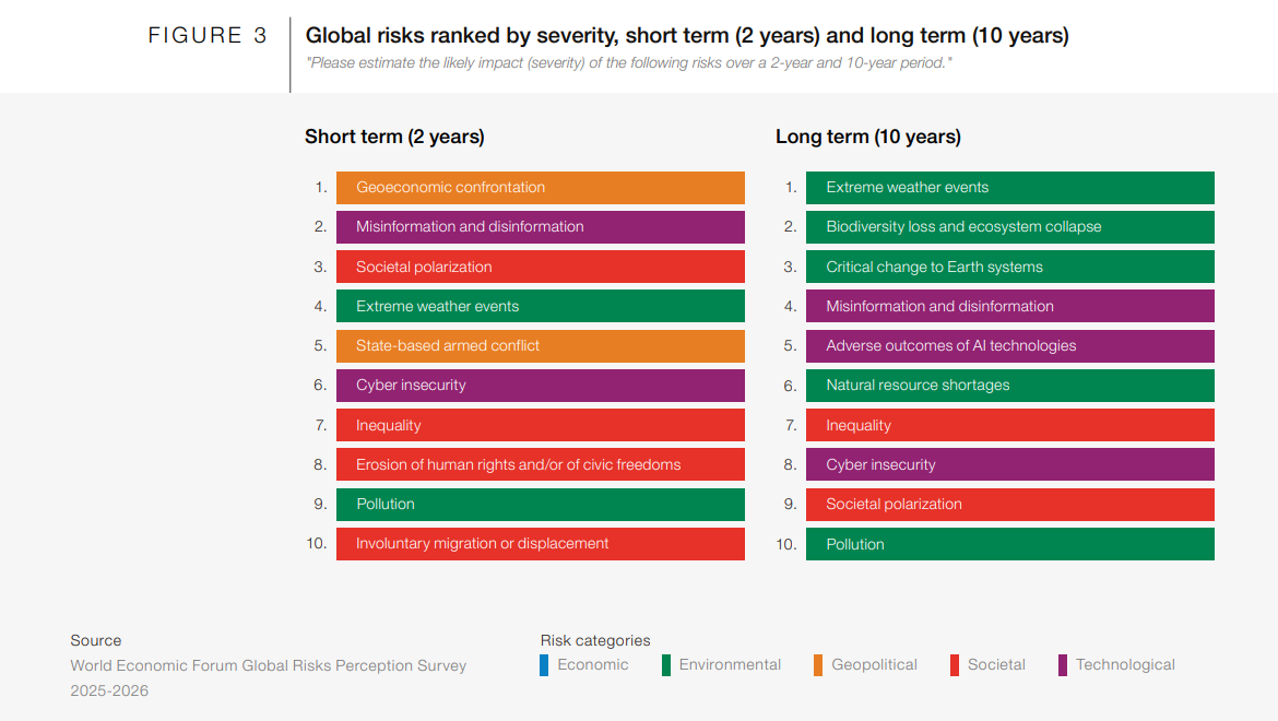 Yet global leaders identify climate-driven disruption as the most likely defining risk of the 2030s. Looking a decade into the future, climate collapse and extreme weather dominate the risk landscape, according to the World Economic Forum’s newly published Global Risks Report 2026 . Economic downturn, by contrast, sits far lower on the list at 24.