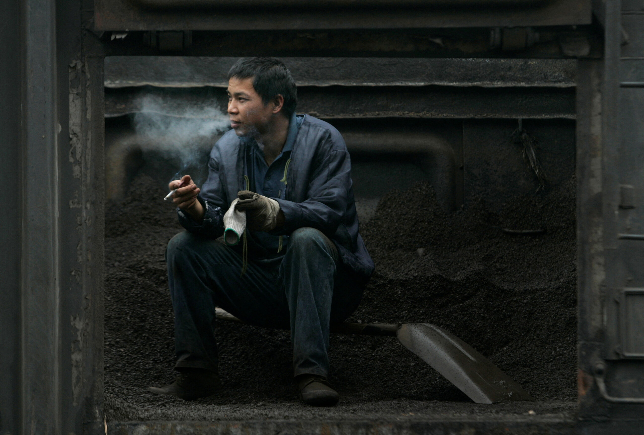 A man rests at a coal trade centre on the outskirts of Guiyang, capital of the Guizhou province in southwest China, February 14, 2007. REUTERS/Jason Lee (CHINA)