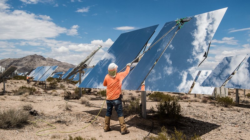 Contracted workers clean Heliostats at the Ivanpah Solar Project, in California, US (Photo: DENNIS SCHROEDER / NREL/Flickr)